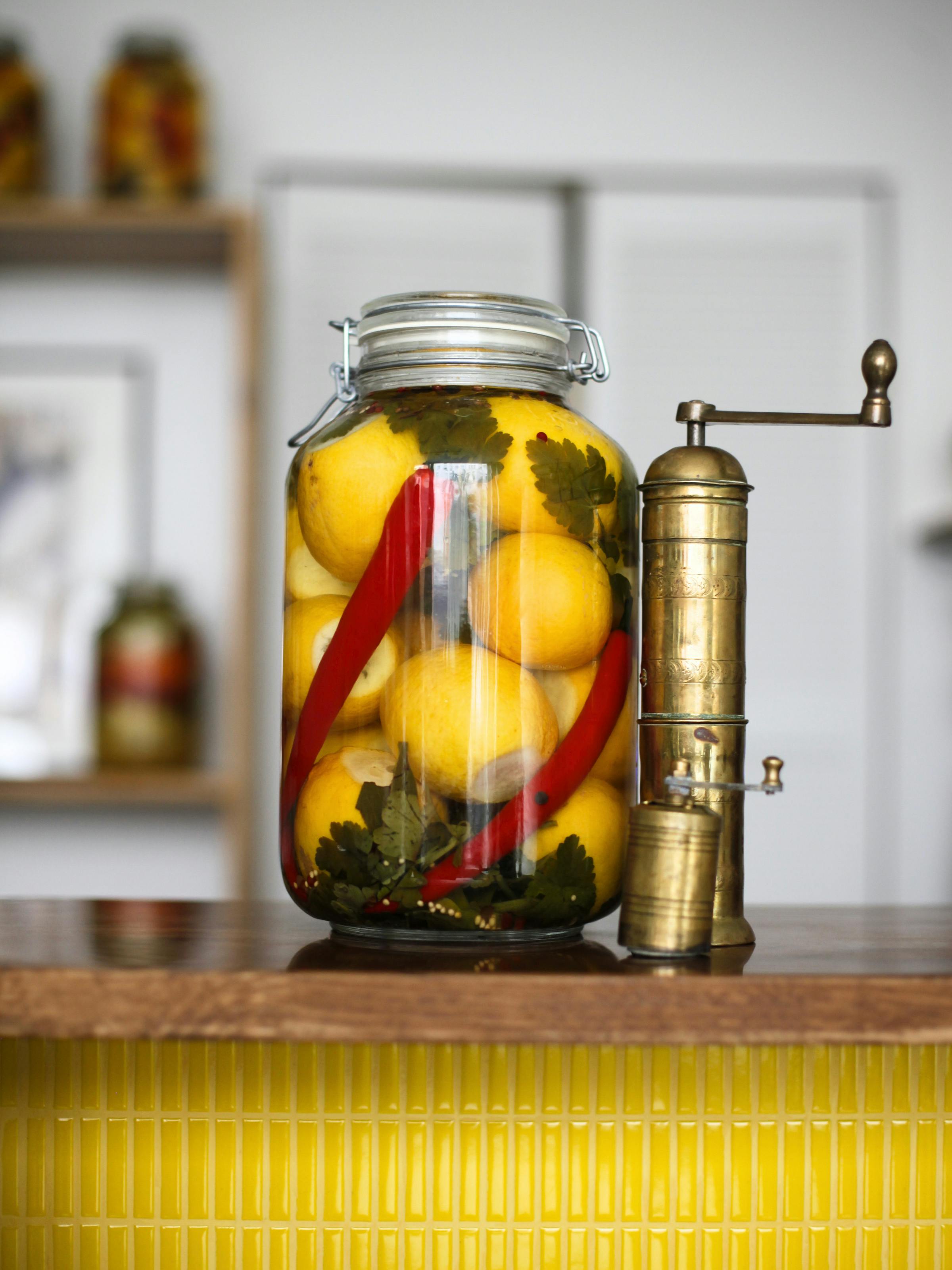 In small space with a characteristic floor, we created a colorful and happy atmosphere which brings the sun and joy of Tel Aviv. Working on a limited budget, we used our creativity to maximize the use of the existing elements. The wooden shelves, which once were uses to display breads, became a display of colorful jars filled with colorful pickled vegetables. Together with the bright yellow counter, it creates a joyful space which stands out and attracts the by-passers.