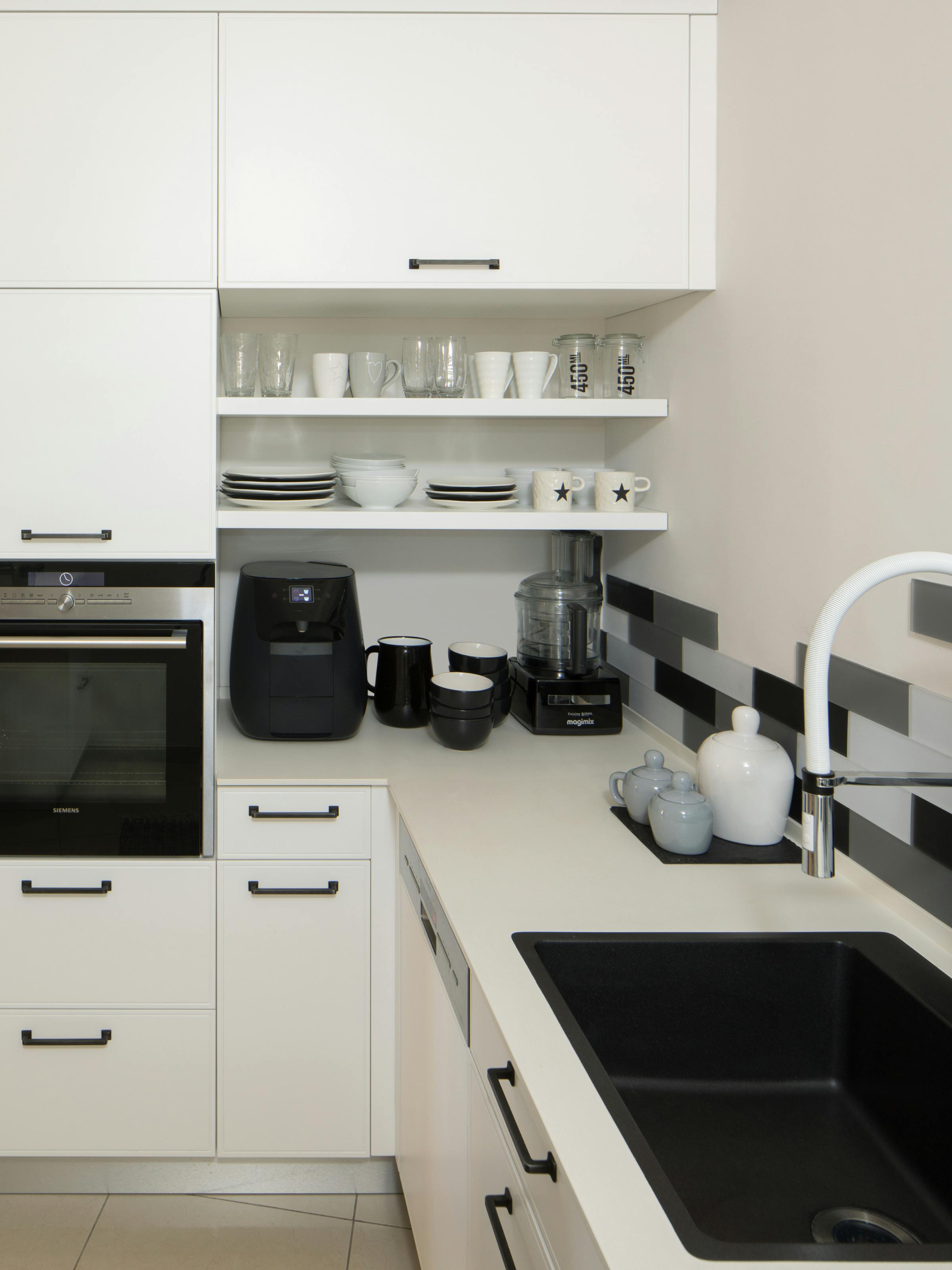 The kitchen features modern, functional design with white cabinets, contrasting black handles, and a striking glass tile wall in black, white, and grey.